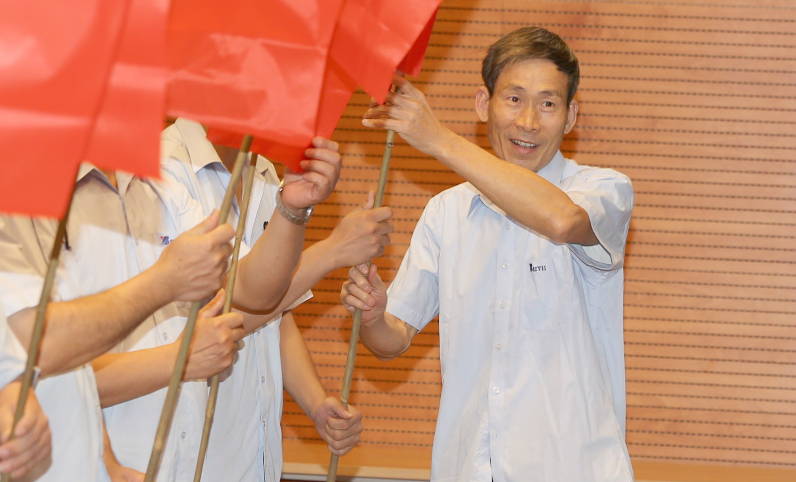 胡明聰總裁將十二面鮮紅的隊(duì)旗熱情而有力地授予十二支隊(duì)伍的代表,這不僅僅是一面代表榮譽(yù)和責(zé)任的旗幟,更是一面滿含期望與囑托的旗幟,是一代又一代白云人的傳承與發(fā)展的旗幟!十二支隊(duì)伍接過(guò)沉甸甸的隊(duì)旗后立即開(kāi)始了認(rèn)真而又熱烈的團(tuán)隊(duì)文化創(chuàng)作,似乎想用自己精心創(chuàng)作的隊(duì)名回應(yīng)總裁的鼓勵(lì)與期許,“榮耀隊(duì)”、“降龍隊(duì)”、“人人爭(zhēng)先隊(duì)”……綻放出一線管理者們意氣風(fēng)發(fā)、朝氣蓬勃的風(fēng)采。全場(chǎng)起立,莊嚴(yán)的國(guó)歌聲將整場(chǎng)的氛圍推向高潮,“前進(jìn)、前進(jìn)、前進(jìn)進(jìn)……”氣勢(shì)磅礴的樂(lè)曲再次點(diǎn)燃了每個(gè)人銳意進(jìn)取的奮斗精神!